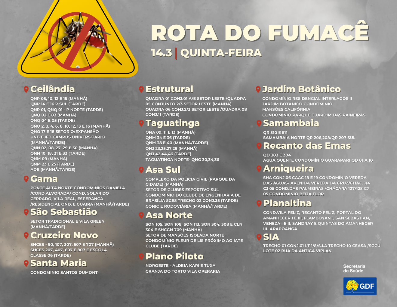Recomendação da Vigilância Ambiental é que as pessoas abram portas e janelas de suas residências quando passar o veículo do inseticida de ultrabaixo volume (UBV), para maior eficácia do produto; aplicações serão feitas das 4h às 6h e das 17h às 19h.