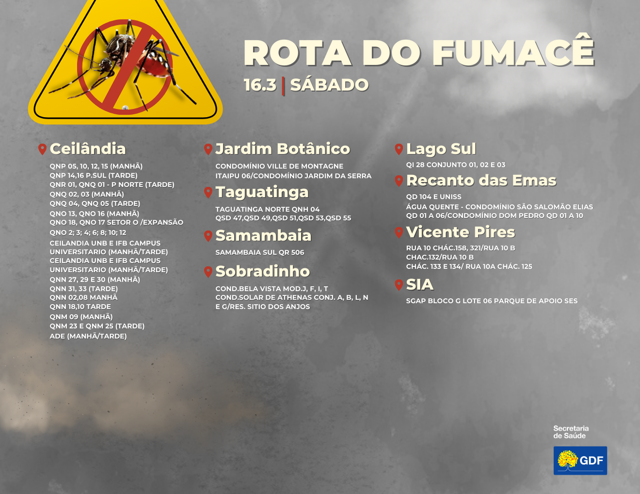 Recomendação da Vigilância Ambiental é que as pessoas abram portas e janelas de suas residências quando passar o veículo do inseticida de ultrabaixo volume (UBV), para maior eficácia do produto; aplicações serão feitas das 4h às 6h e das 17h às 19h.