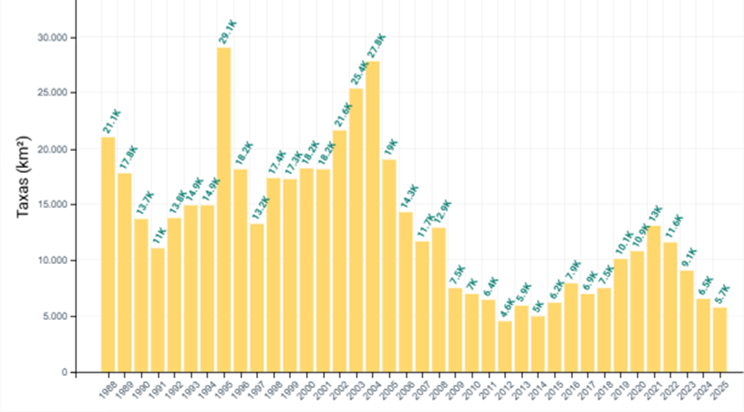 Figura 2 – Desmatamento da floresta primária na Amazônia Legal entre 1988 e 2025 em milhares de km2, com resolução mínima de 6,25 hectares e sem contabilizar perdas por incêndios. Os dados referem-se ao desmatamento entre 1 de agosto e 31 de julho de cada ano. Fonte: TerraBrasilis, INPE, 2025