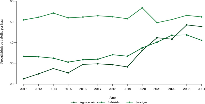 O Gráfico 6 demonstra o crescimento da produtividade do trabalho nos setores de Serviços, Indústria e Agropecuária. Observa-se um crescimento moderado para o Setor de Serviços, na ordem de 3% entre 2012 e 2024, ainda que seja o setor de maior produtividade absoluta[ii] devido à sua relevância no agregado produtivo, e à sua natureza heterogênea que engloba algumas atividades de produtividade mais elevada. O Setor da Indústria, por sua vez, apresentou um crescimento de 23%, crescendo em quase R$ 10 de produtividade hora, e passou do segundo setor com mais produtividade para o terceiro em decorrência da expressiva expansão em produtividade do setor Agropecuário, com uma variação de cerca de 112% ao longo do período, indo de pouco mais de R$ 20 por hora para quase R$ 50.