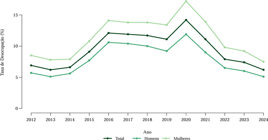 O viés do conflito trabalho-família, portanto, ressurge como um instrumento de análise também para o caso brasileiro, que conta com um desequilíbrio na acomodação de atividades de cuidado, que recaem desproporcionalmente sobre as mulheres. O Gráfico 4 demonstra a trajetória do nível de desemprego no Brasil ao longo do mesmo período analisado anteriormente, de 2012 a 2024. O retrato que se obtém a partir deste recorte, para além de reforçar o quadro de desigualdade entre homens e mulheres no mercado de trabalho também no que se refere ao desemprego, revela uma volatilidade maior quando comparado ao caso chileno, em decorrência da crise política e econômica pela qual passou o Brasil a partir de 2015, chegando a ultrapassar a taxa de 12% em 2016. A pandemia da COVID-19, por sua vez, leva a um outro pico na taxa de desocupação, que chegou a 14% em 2020.