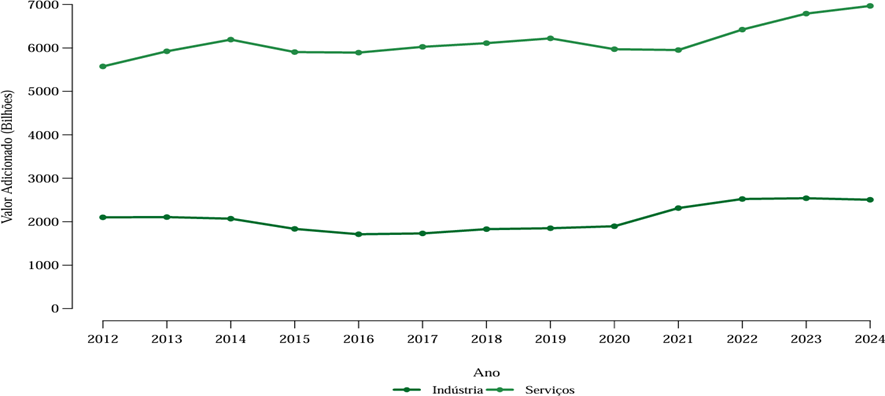 Gráfico 2 – Evolução do Valor Adicionado Bruto Real do Brasil – Indústria e Serviços (2012-2024).